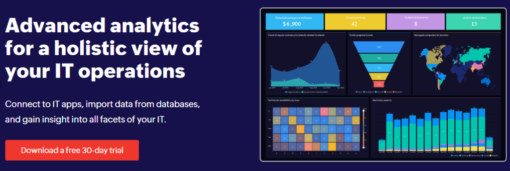 ManageEngine Analytics Plus (MA+) is a powerful business intelligence and IT analytics solution specialized to handle IT data and helps upper management and IT admins keep track of the entire IT environment through its out-of-the-box integration with IT applications, databases, and key products such as ServiceDesk and ServiceNow and Jira Software. MA+ helps by integrating various systems into single-point access to gather data, generate reports, and share insights with stakeholders across your organization.