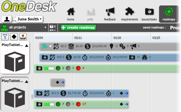 Transparent product roadmaps are built from inputs across the platform, from ideas and issues to requirements, tasks, resources, and costs. A quick glance at the roadmaps you create helps with decision-making.