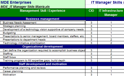 1. The IT Manager Skills Matrix is a FREE MDE Product Sample by the IT Manager Institute. The skills matrix helps you discover what is needed for the following roles: