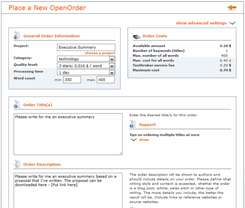 If you’re using TextBroker for the first time, it’s advisable to submit an OpenOrder in order to get the best feedback.