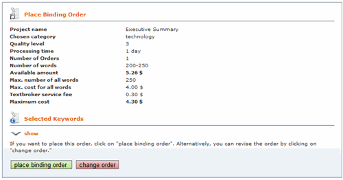 In general, TextBroker allows you as a client to specify your writing requirements as well as choose from a range of qualified writers to work on your text.