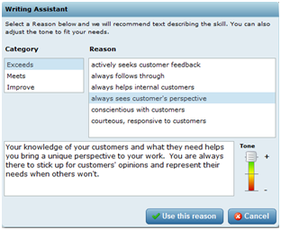 As soon as the skill pool is ready, you can start your assessment with the suggestions provided by Writing Assistant. It helps you choose the right comment on employee’s performance. You can indicate whether the employee meets or exceeds standards, or if they need to improve in certain areas. You choose the reason behind that opinion and select more or less positive tone of your comment. With that tool, a manager is able to choose words for any situation and create a backbone of their report in just a few clicks,  so the only thing left to do is to fill in detailed information and examples that will be discussed in a formal meeting.