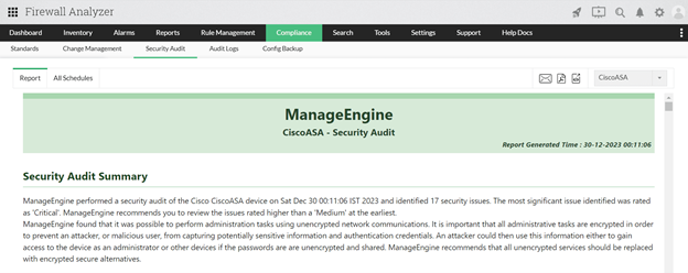 ManageEngine Firewall Analyzer is a robust tool designed to simplify and enhance the security auditing process. It provides a comprehensive set of features for conducting security audits, including: